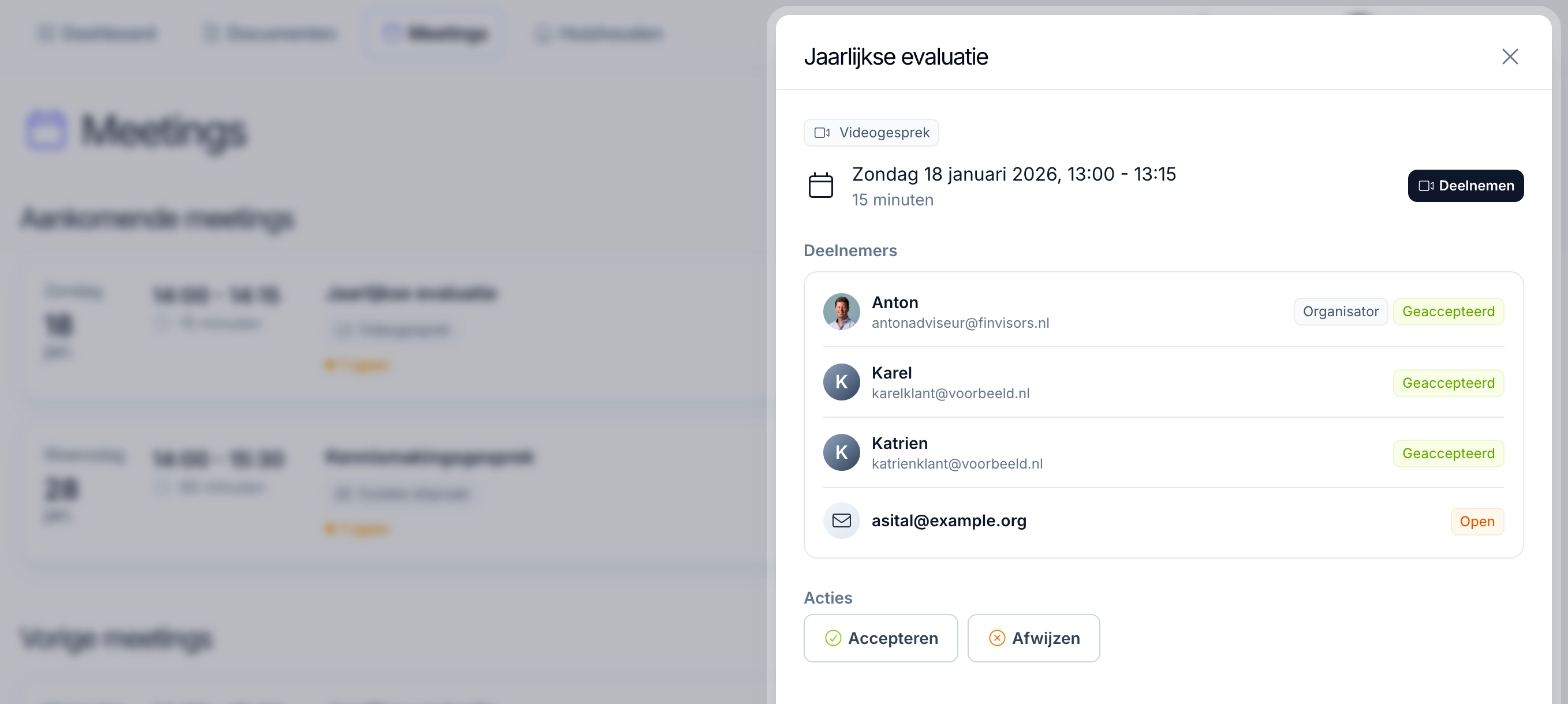 Deelnemers reageren via de link in de uitnodigingsmail. Je ziet hun reactie bij de afspraakdetails. Klanten zien in hun klant-dashboard ook meetings en kunnen daar ook reageren.