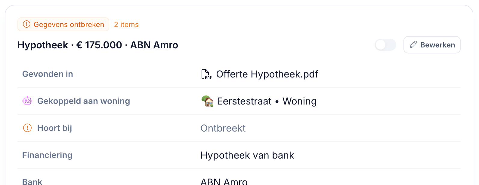 Als dit is gebeurd dan zie je dat met de aanduiding van het robot icoontje, zie de screenshot hieronder. Een voorbeeld hier van is als je adres in het document wordt gevonden, en je hebt je huis al toegevoegd, dan koppelen we het automatisch aan je huis als het adres hetzelfde is.